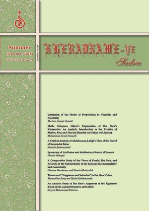 Ibn Sina’s kinematics, particularly based on his book of al-Shifa, has greatly influenced the thinkers of the Islamic period. Al-Shifa (The Book of Healing) is a philosophical encyclopedia, which, in Ibn Sina’s words, consists of four sections on logic, physics, mathematics, and metaphysics. The comprehensive and detailed nature of this work persuaded later scholars to write glosses, rather than comments and interpretations, on it. However, there are some short treatises whose writers have tried to explain some of the complexities regarding Ibn Sina’s kinematics in al-Shifa without making a direct reference to the title of this book in their own works. Hakim Mulla Solayman Gilani, a philosopher of the 11th century (AH), has explored some of the difficulties regarding the definitions of motion, types of motion, continuous motion, and cutting motion in a short treatise entitled Motion, Rest, and Time. In this treatise, in addition to paying particular attention to the views of Ibn Sina and Mulla Sadra, Hakim Gilani has also considered the views of some other thinkers such as Fakhr al-Din Razi, Athir al-Din Abhari, Khwajah Nasir al-Din Tusi, and Mir Seyyed Jurjani concerning the problem of motion. Hakim Gilani’s treatise consists of three parts: 1) An introduction to the definitions of motion, rest, and time; 2) Types of motion; 3) Responses to raised criticisms and objections. This treatise is published for the first time as an appendix to this paper.